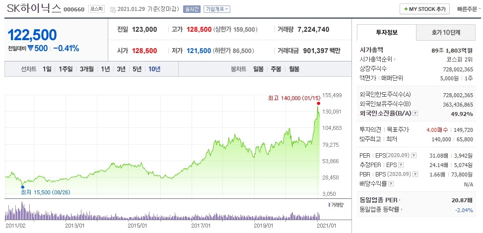 에스케이 하이닉스 주가는 21년 1월 29일 기준 122,500원으로 마감하였습니다.