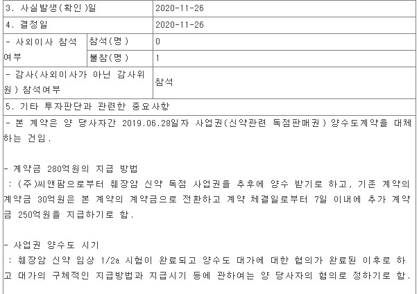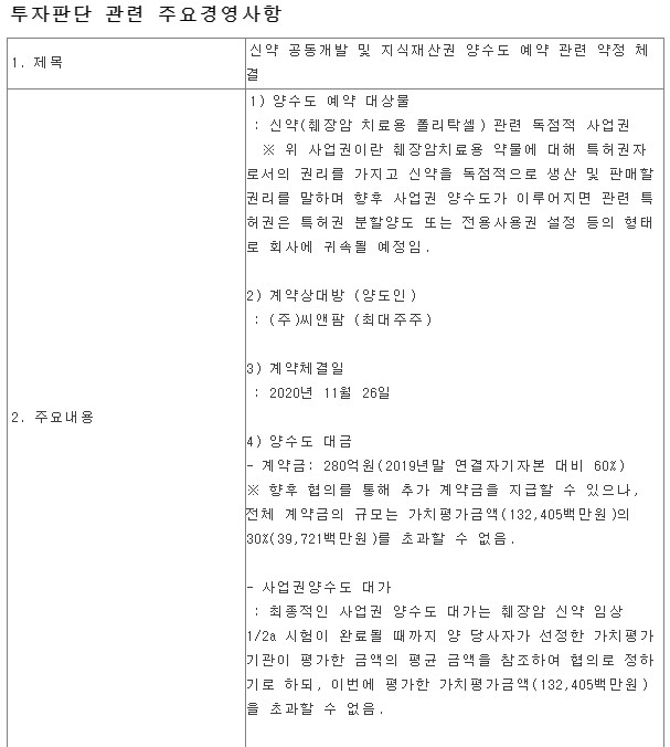 (신약은 췌장암 치료용 폴리탁셀을 말합니다. 계약상대방은 씨앤팜으로 20년 11월 26일 계약 체결되었습니다. 계약금은 280억 원으로 2019년 연결 자기 자본 대비 60%에 해당하는 금액입니다.)