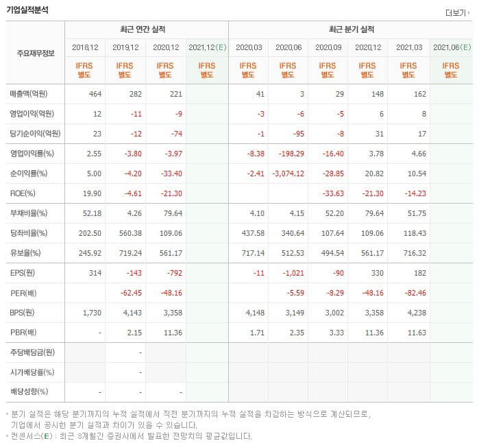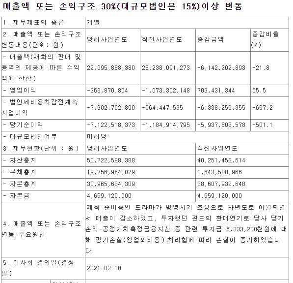 2020년 연간 실적에 대해서 에이스토리는 "제작 준비 중인 드라마가 방영시기 조정으로 차년도로 이월되면서 매출이 감소하였고, 투자했던 펀드의 환매연기로 당사 당기손익-공정가치 측정 금융자산 중 관련 투자금 6,333,200천 원에 대해 평가손실 처리함에 따라 손실이 증가하였다"라고 하였습니다.